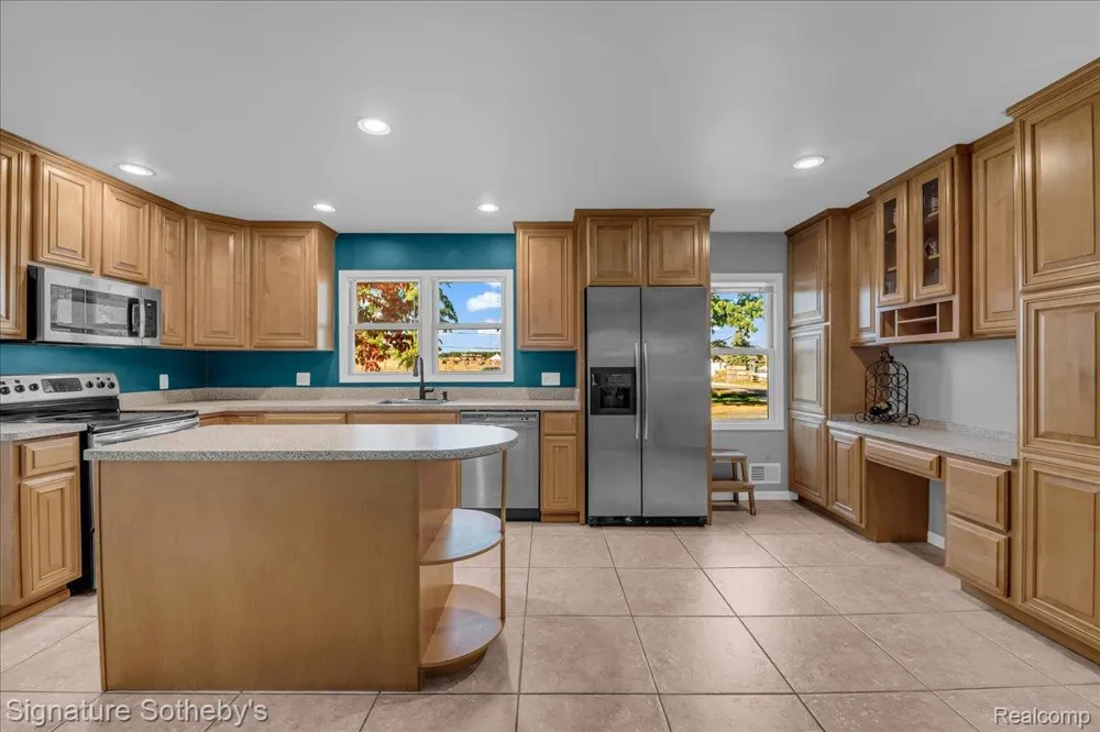Blending small-town charm with everyday convenience, this 3-bedroom, 2-bathroom home offers 1,821 square feet of thoughtfully designed living space on a generous .67-acre setting. Mature trees frame the property, while a circular drive and oversized garage create a welcoming approach. Step inside to a cozy living room where natural light filters through expansive windows, creating an inviting atmosphere. The kitchen showcases abundant cabinetry, stainless appliances, and a central island that opens seamlessly to the dining room. From there, a sliding door extends the living space to a private backyard and spacious deck—ideal for entertaining under the canopy of trees. A finished basement adds valuable flexible space, perfect for a recreation room, home office, or additional storage. Updated baths with quartz counters, a whole-house generator, and ample storage highlight a home designed for both comfort and practicality. Outdoors, two sheds add utility while the surrounding landscape offers year-round enjoyment, from crisp fall afternoons to warm summer evenings. With quick access to freeways and just moments from the local cider mill, the location blends small-town character with everyday convenience.